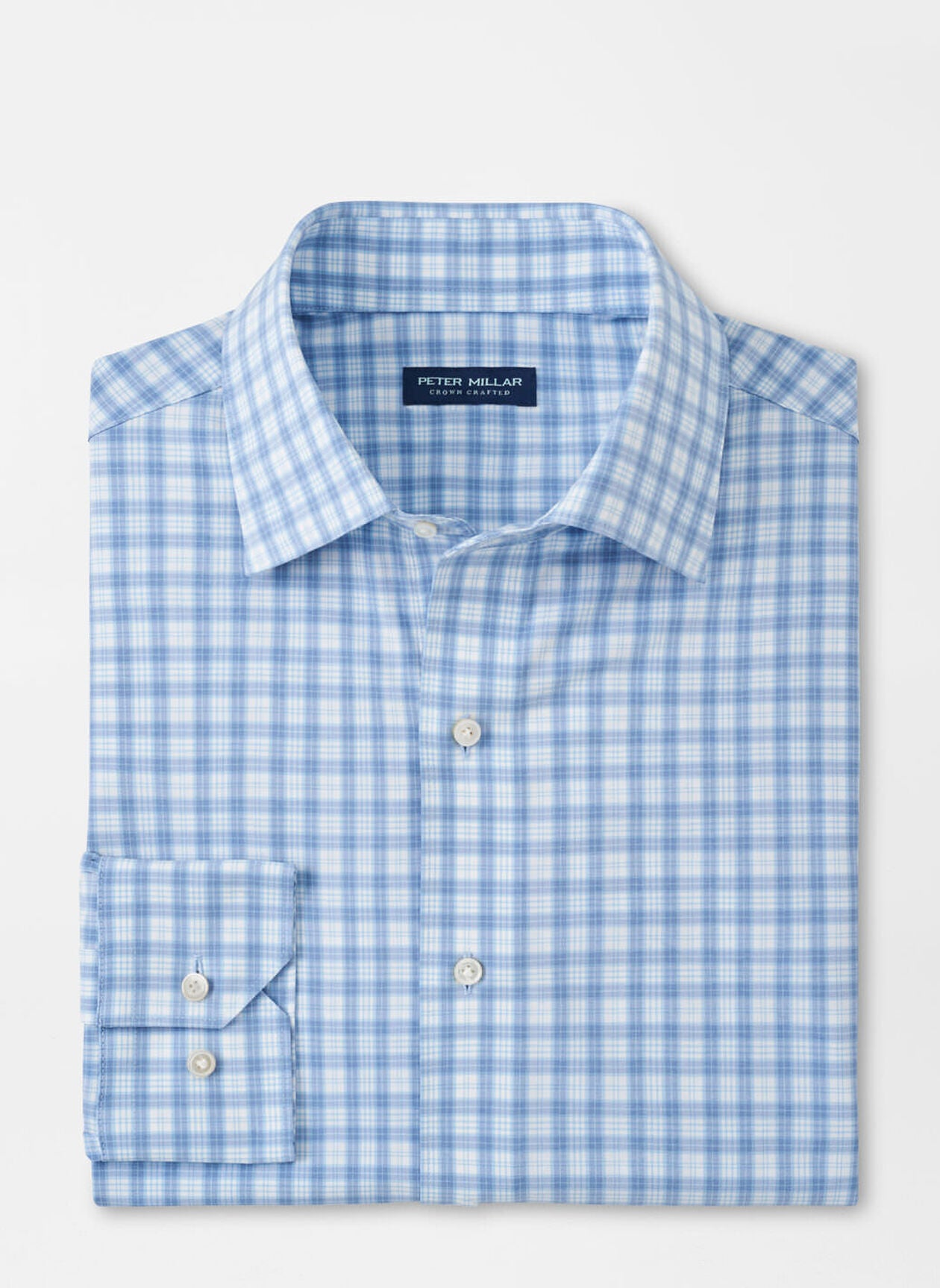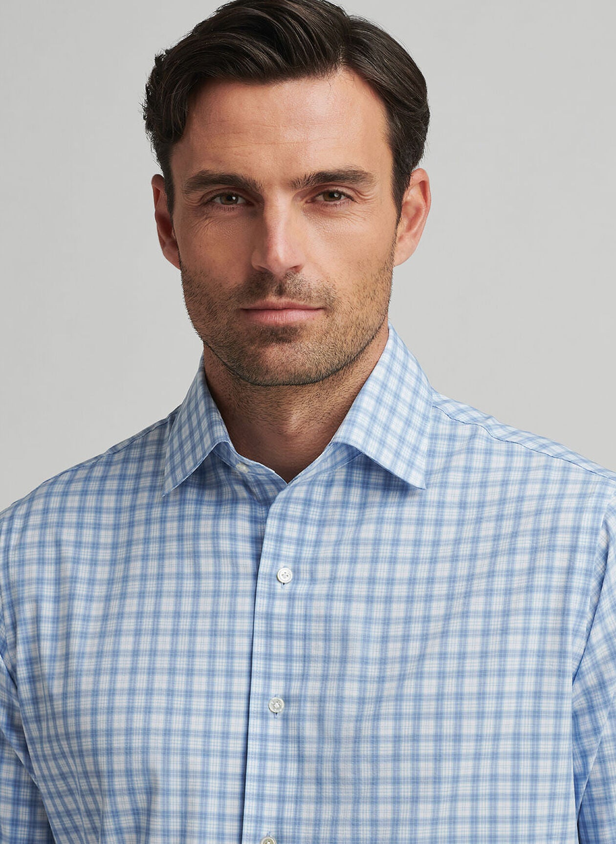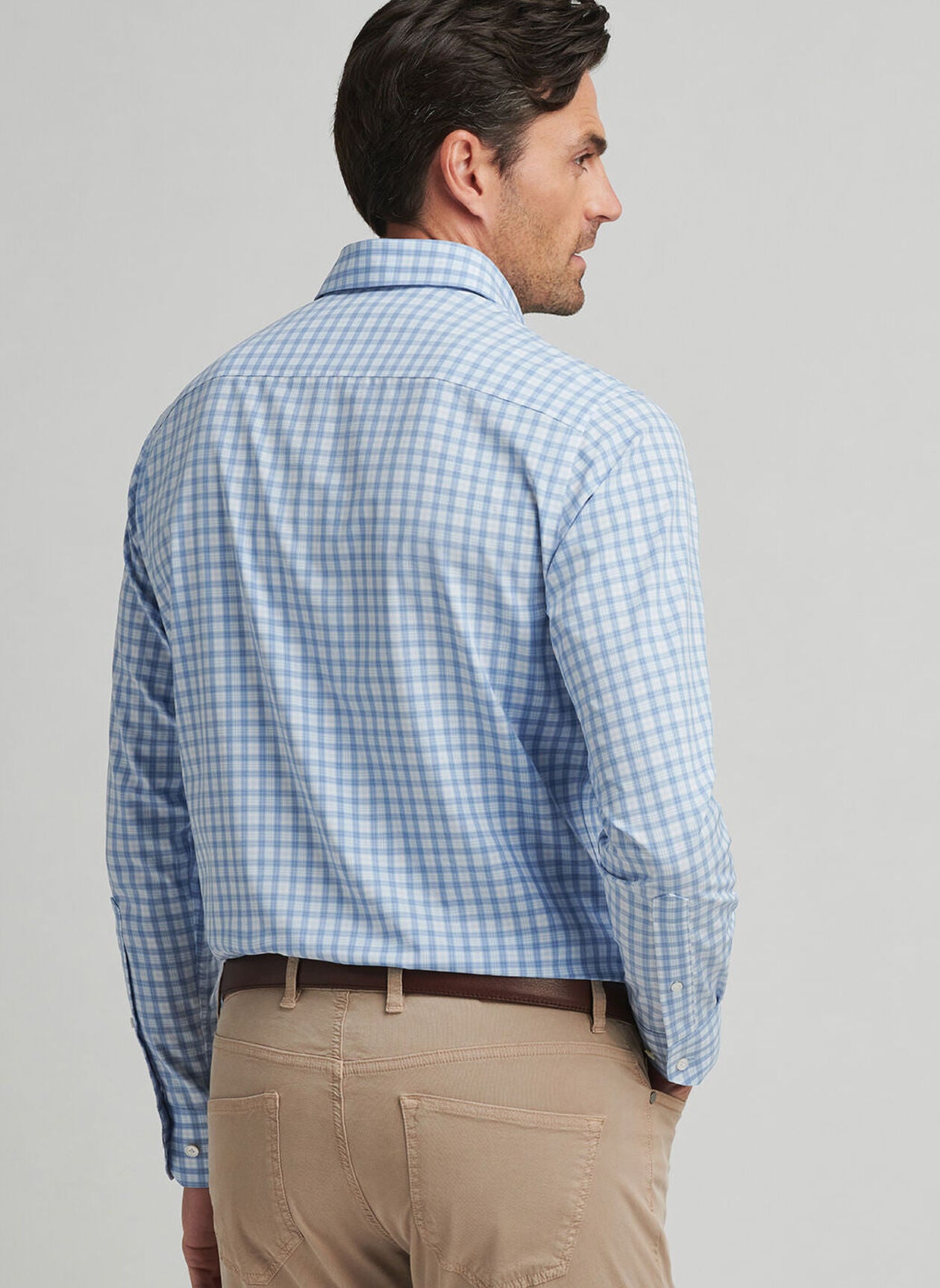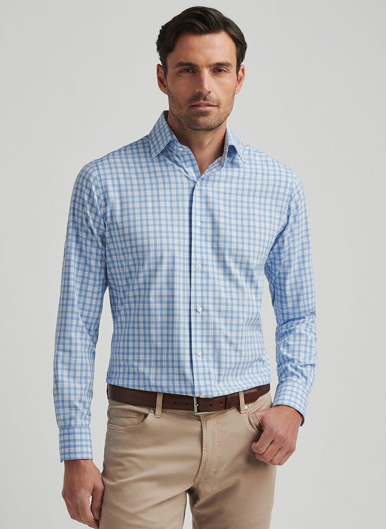 Combining the classic feel of a poplin sport shirt with the ease of a performance fabrication, this shirt offers two-way stretch, wicking and UPF 50+ sun protection. Finished with a spread collar, French placket and mother-of-pearl buttons.