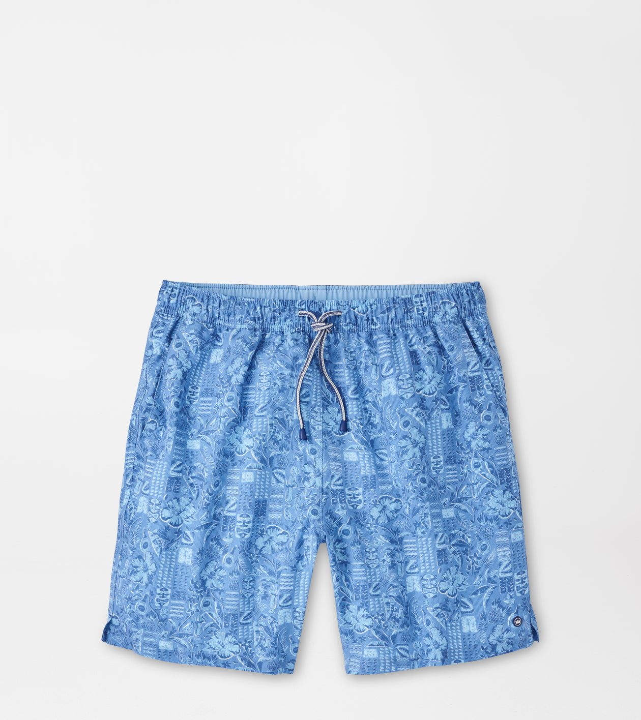 Our Crown swim trunks are a must-have for the beach or the pool. A four-way stretch fabric, fine mesh liner and tagless construction provide all-day comfort. They feature an exclusive hand-designed Hawaiian themed print made in our creative studio. Finished with a 7" inseam.