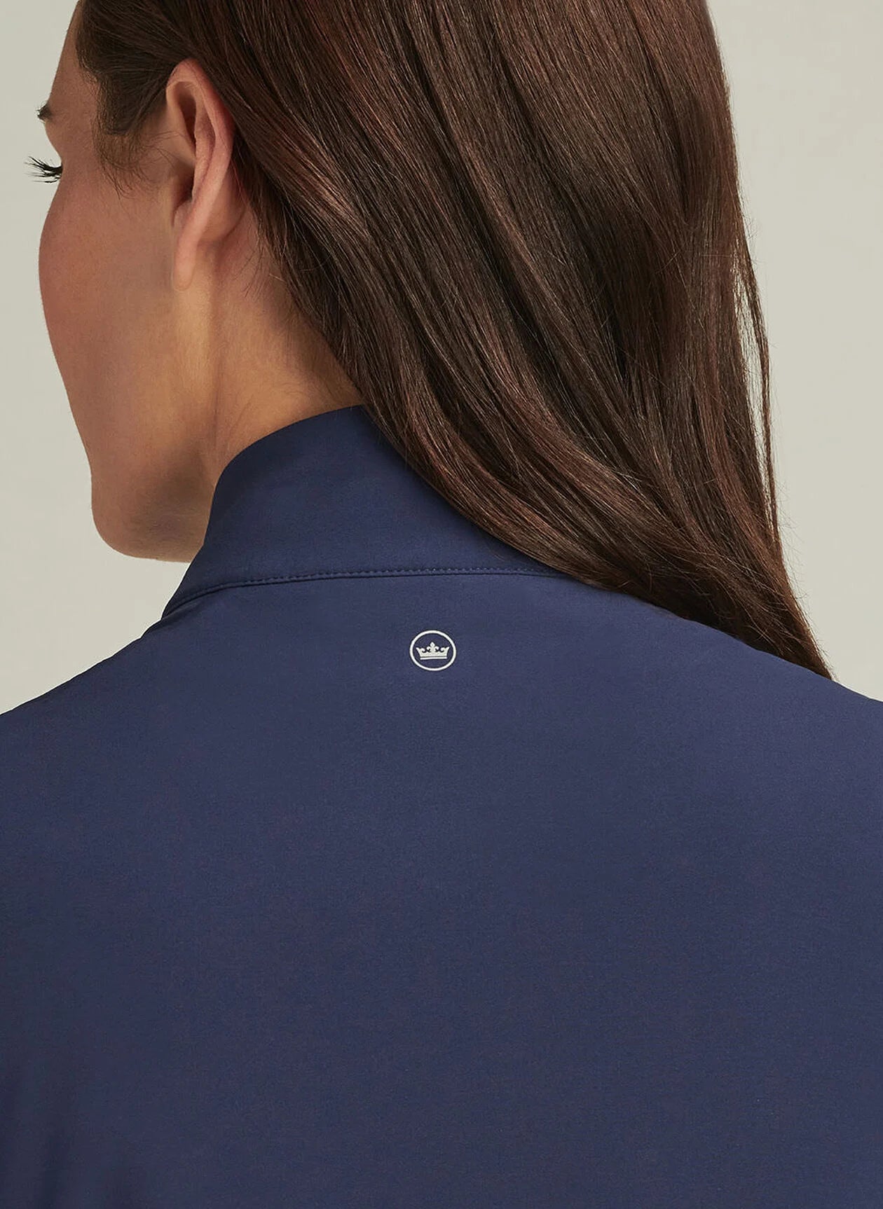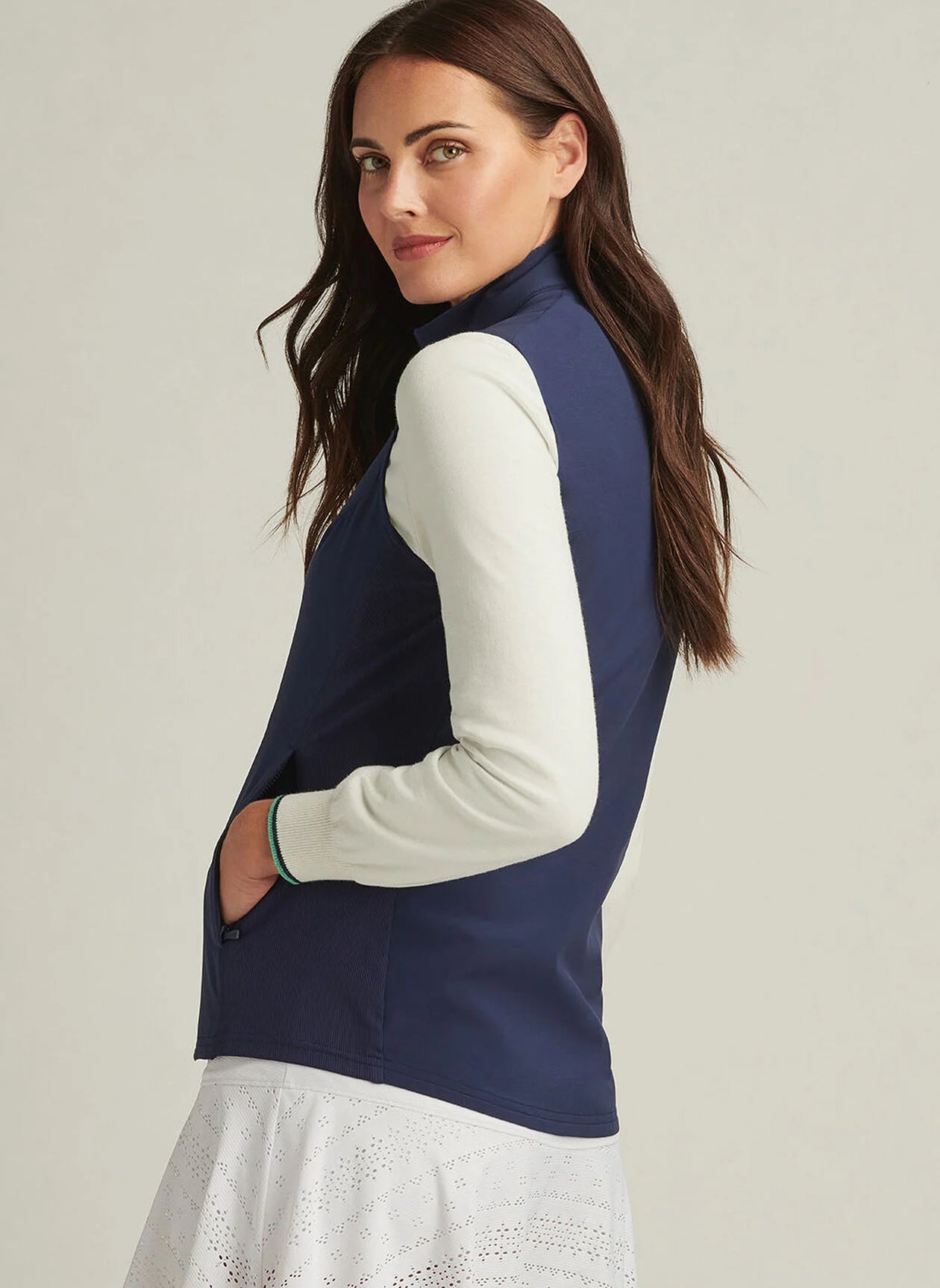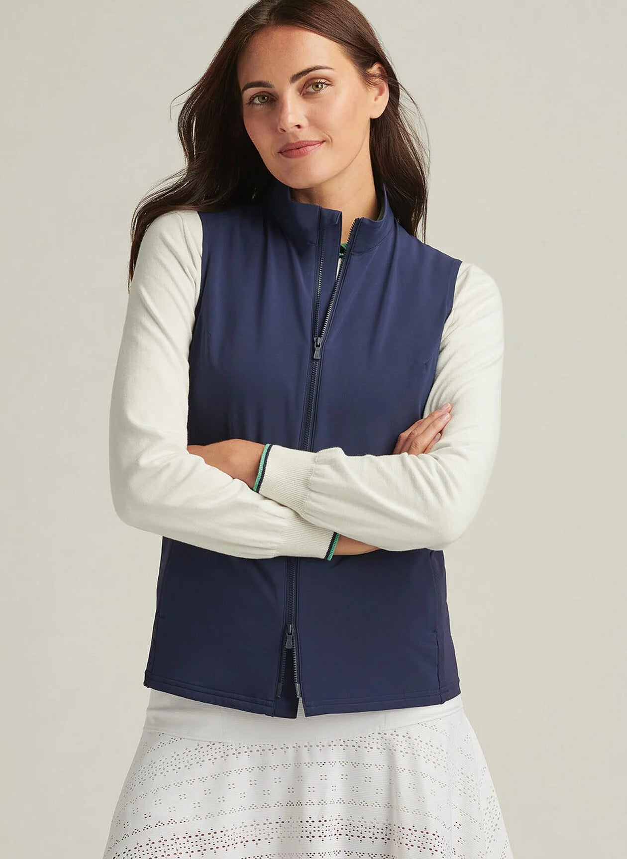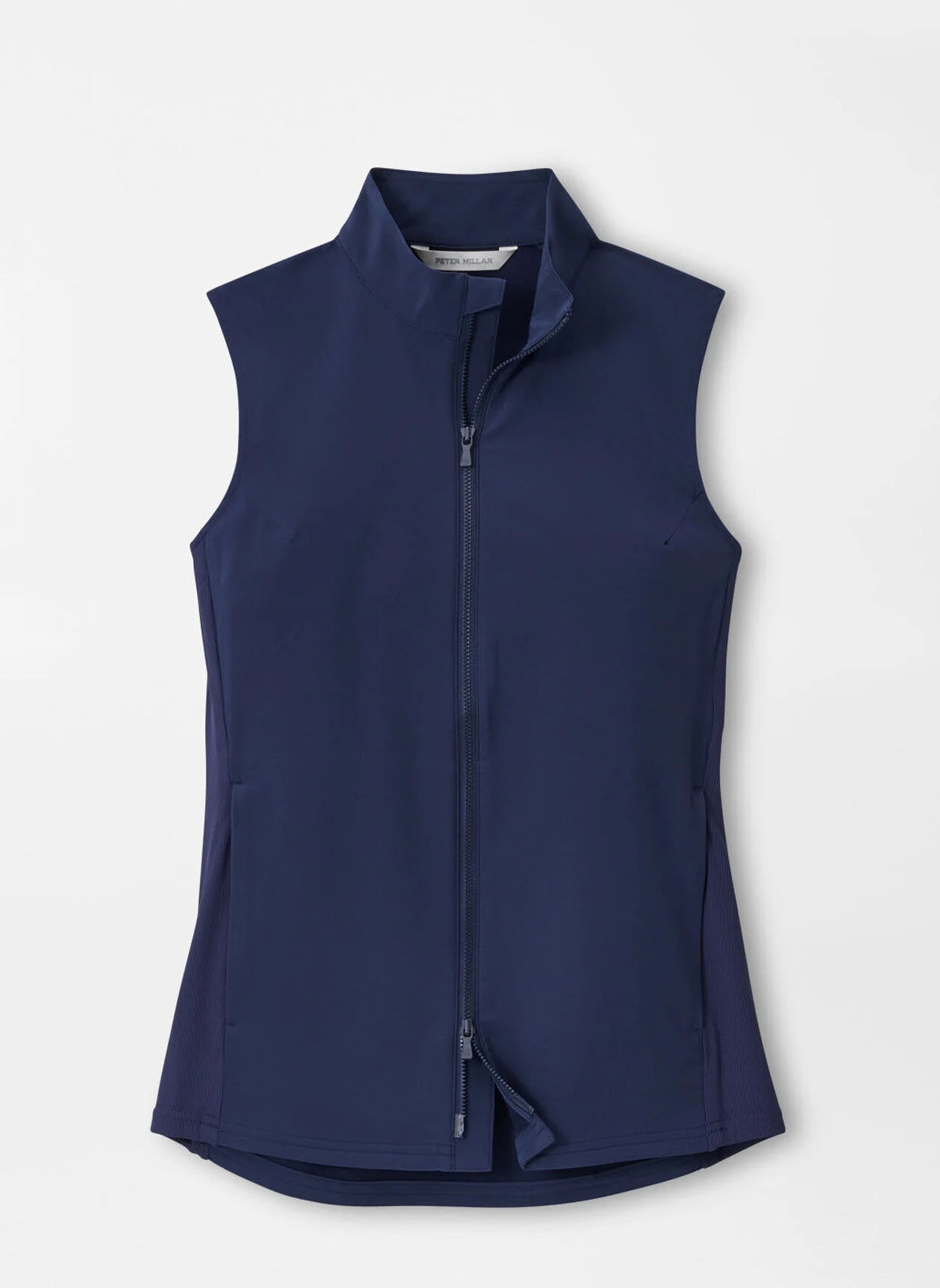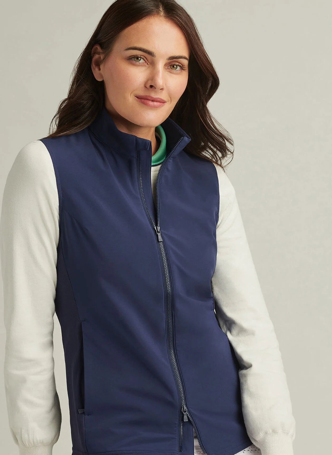 A soft and quiet performance fabric anchors this lightweight wind and water-resistant vest, with an inset rib-knit at the sides for a feminine shape and additional flexibility. Designed to move freely on the course, and styled for versatility, it's an easy-to-pair option perfect for cooler days.